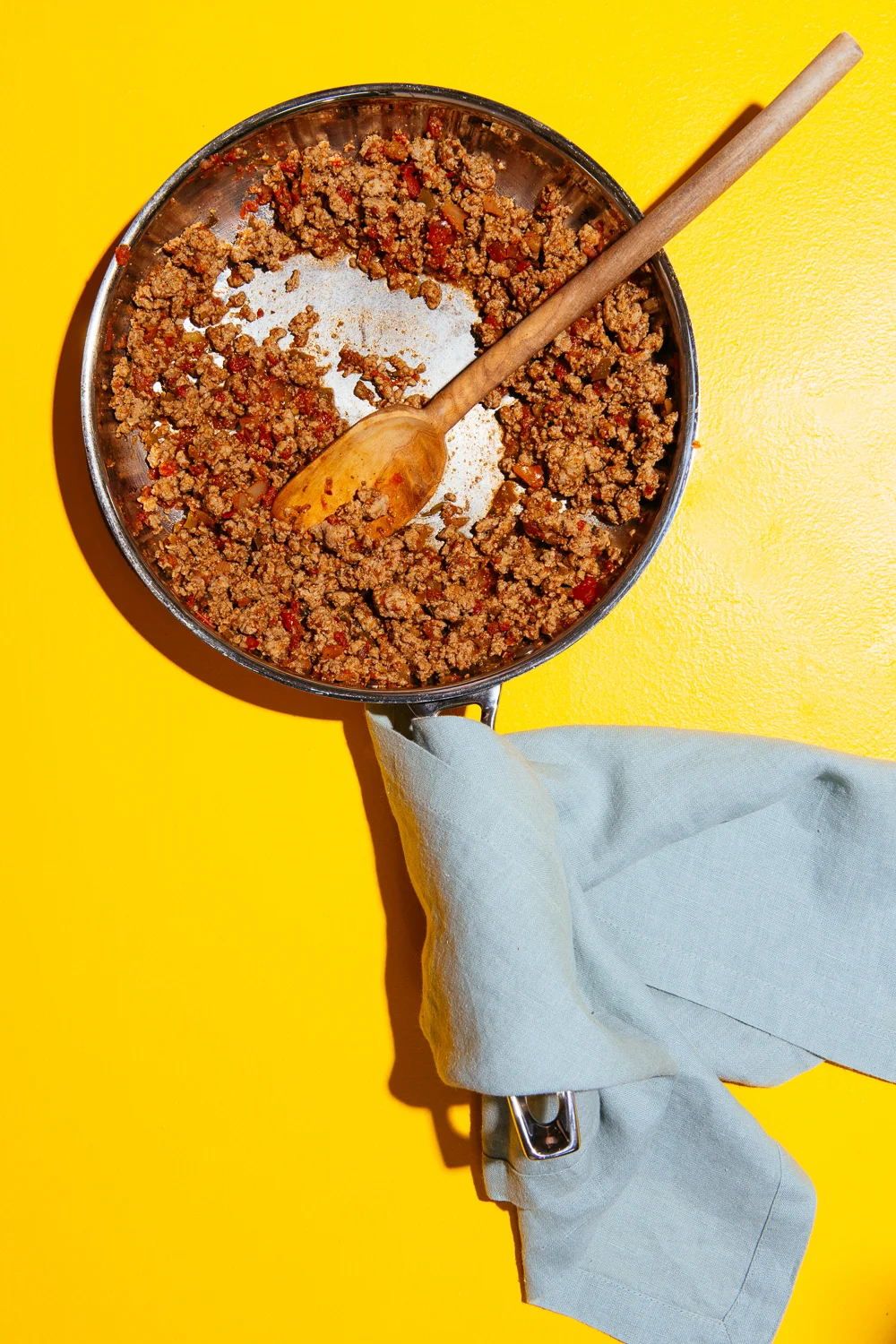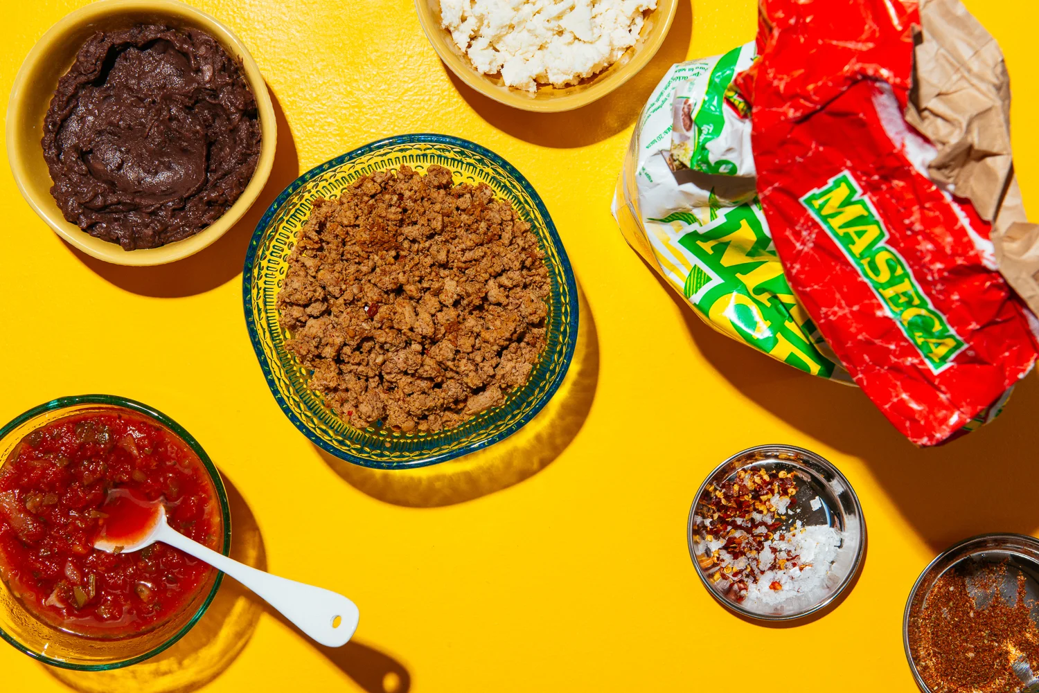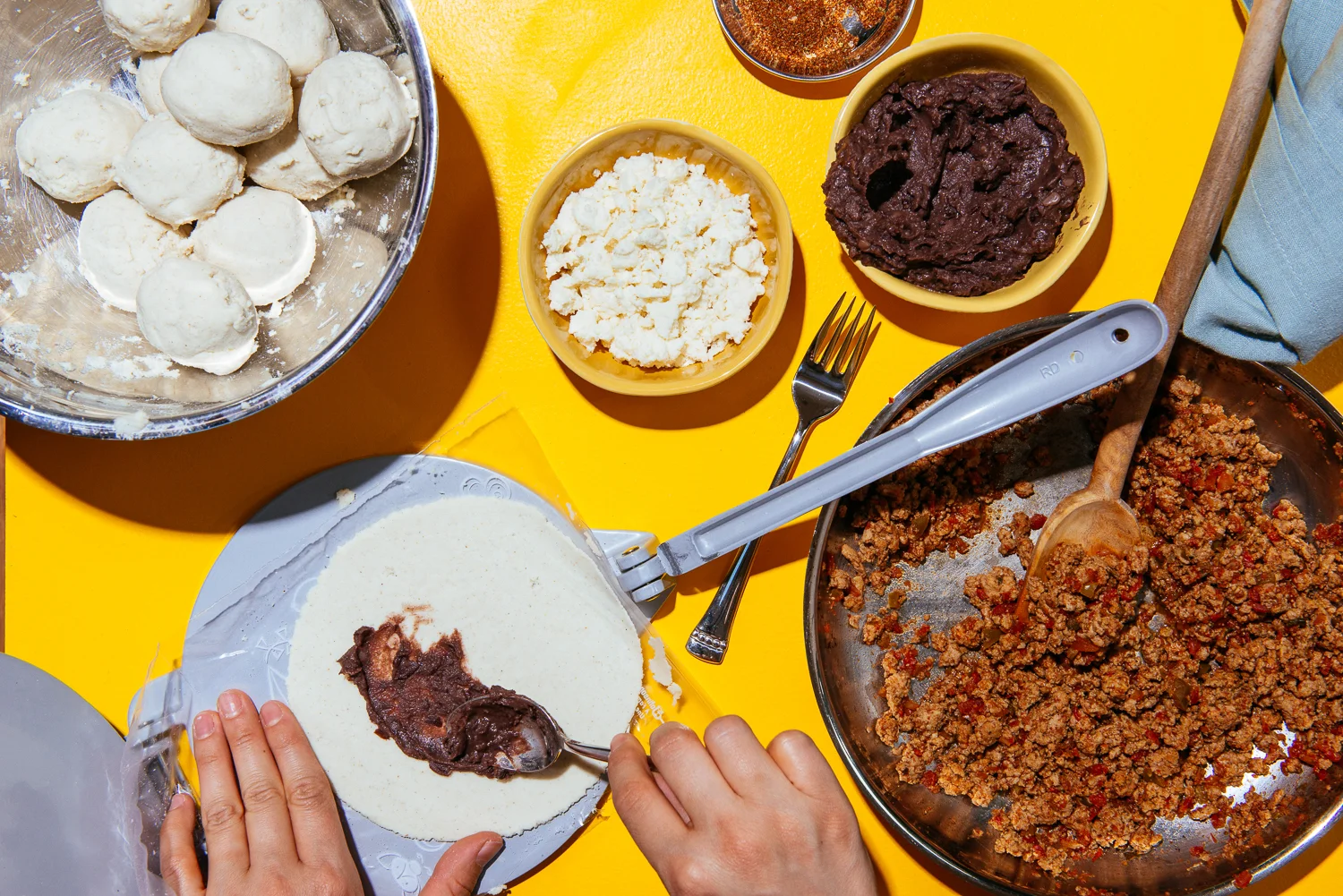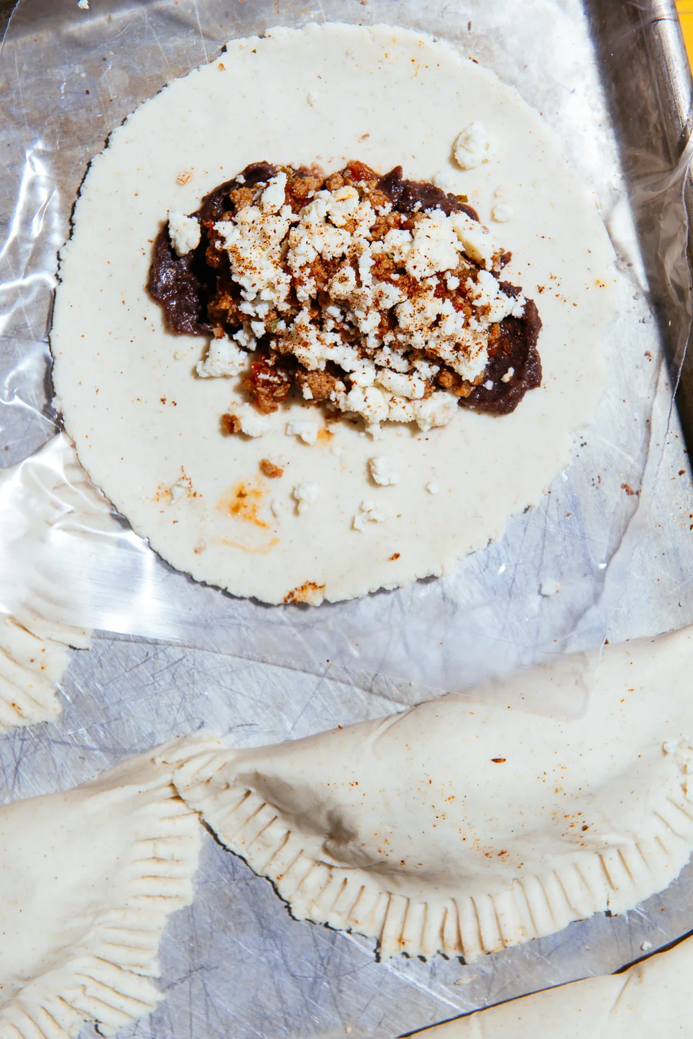 Spread about 1 tablespoon of refried black beans onto the masa, followed by a heaping tablespoon of meat, sprinkle with about 1 teaspoon of cotija cheese and a pinch of taco seasoning.