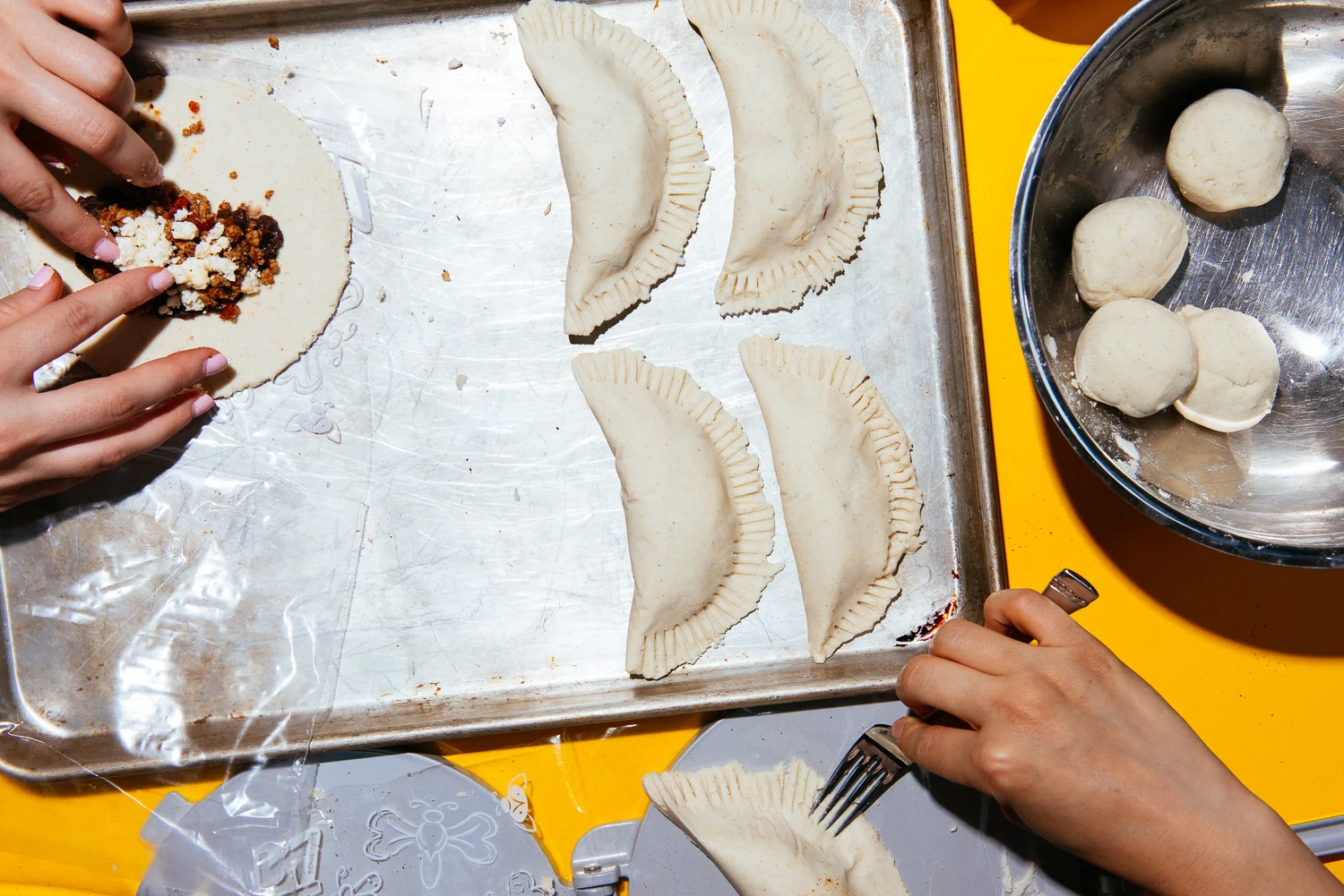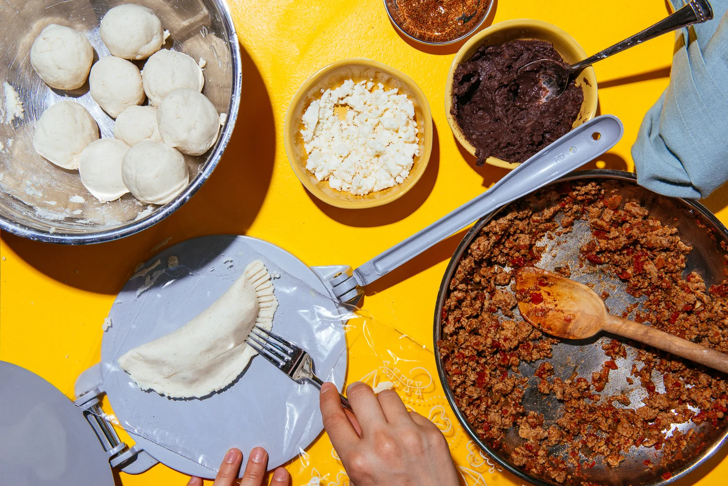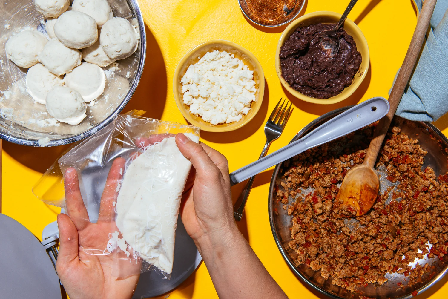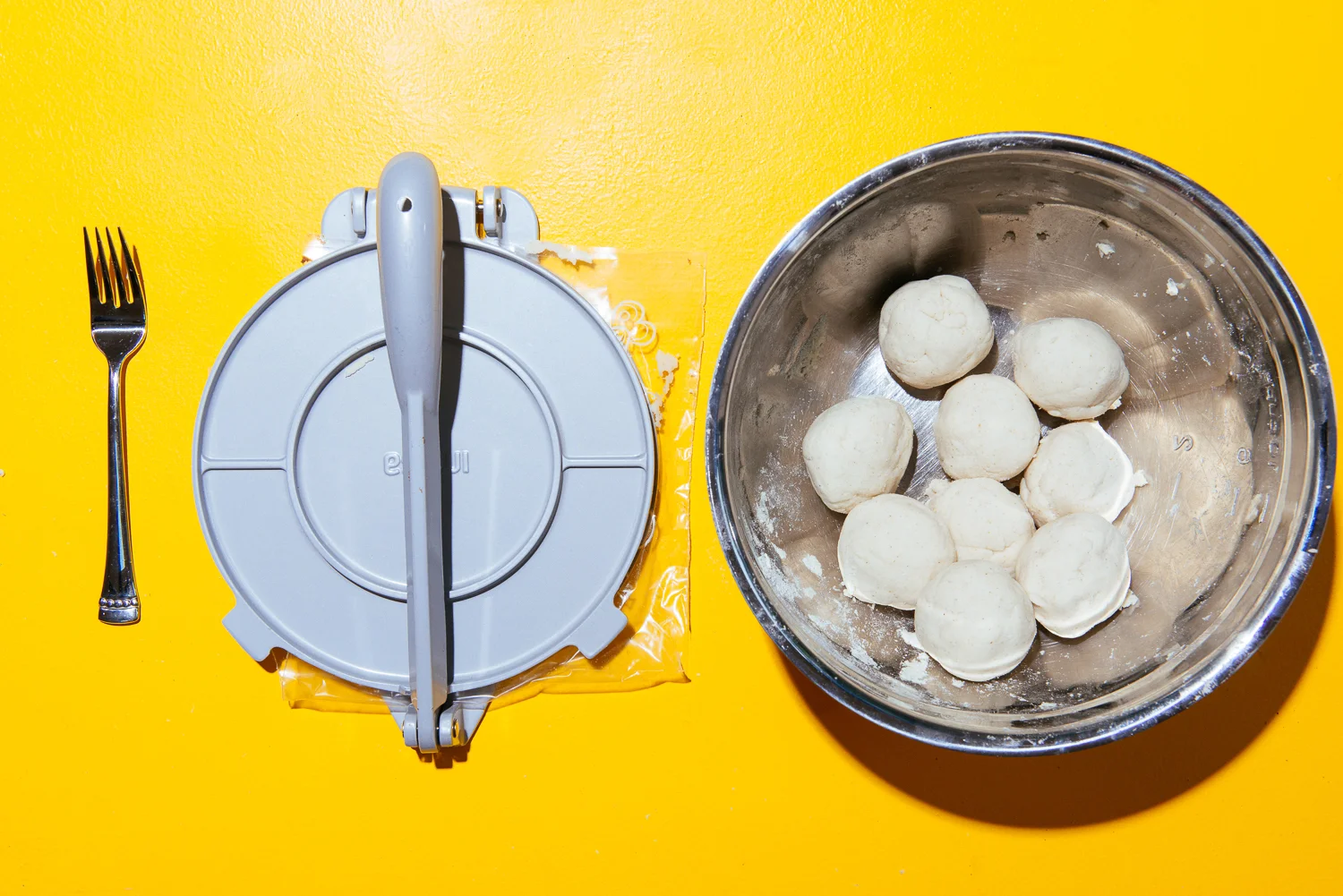 To build the empanadas, use a tortilla press with a Ziploc bag to press the bolas into tortillas, about 6 inches in diameter.